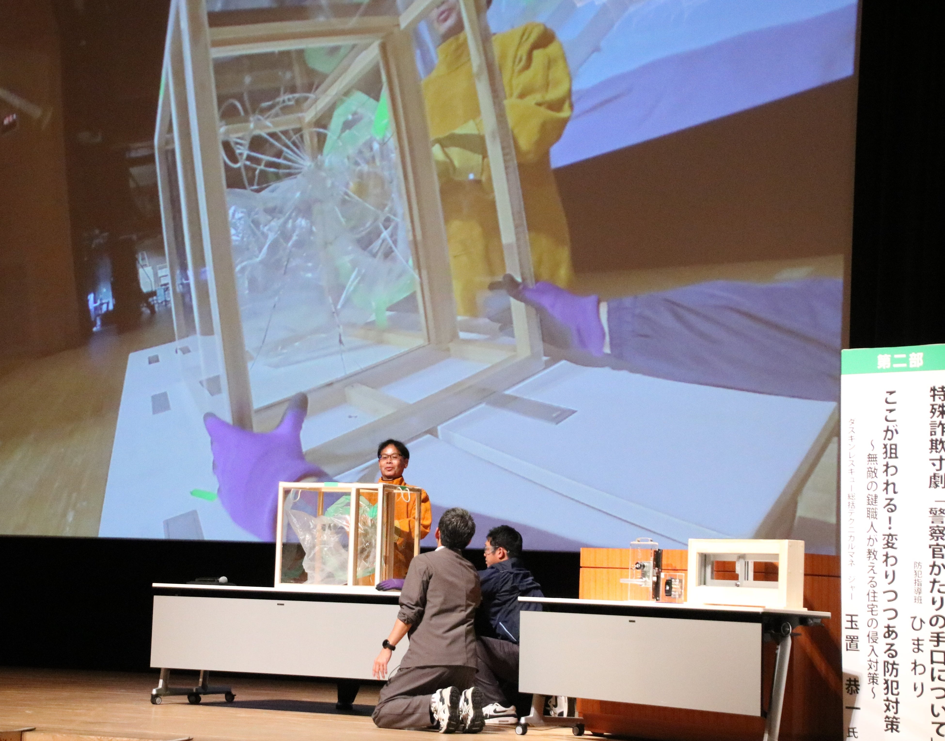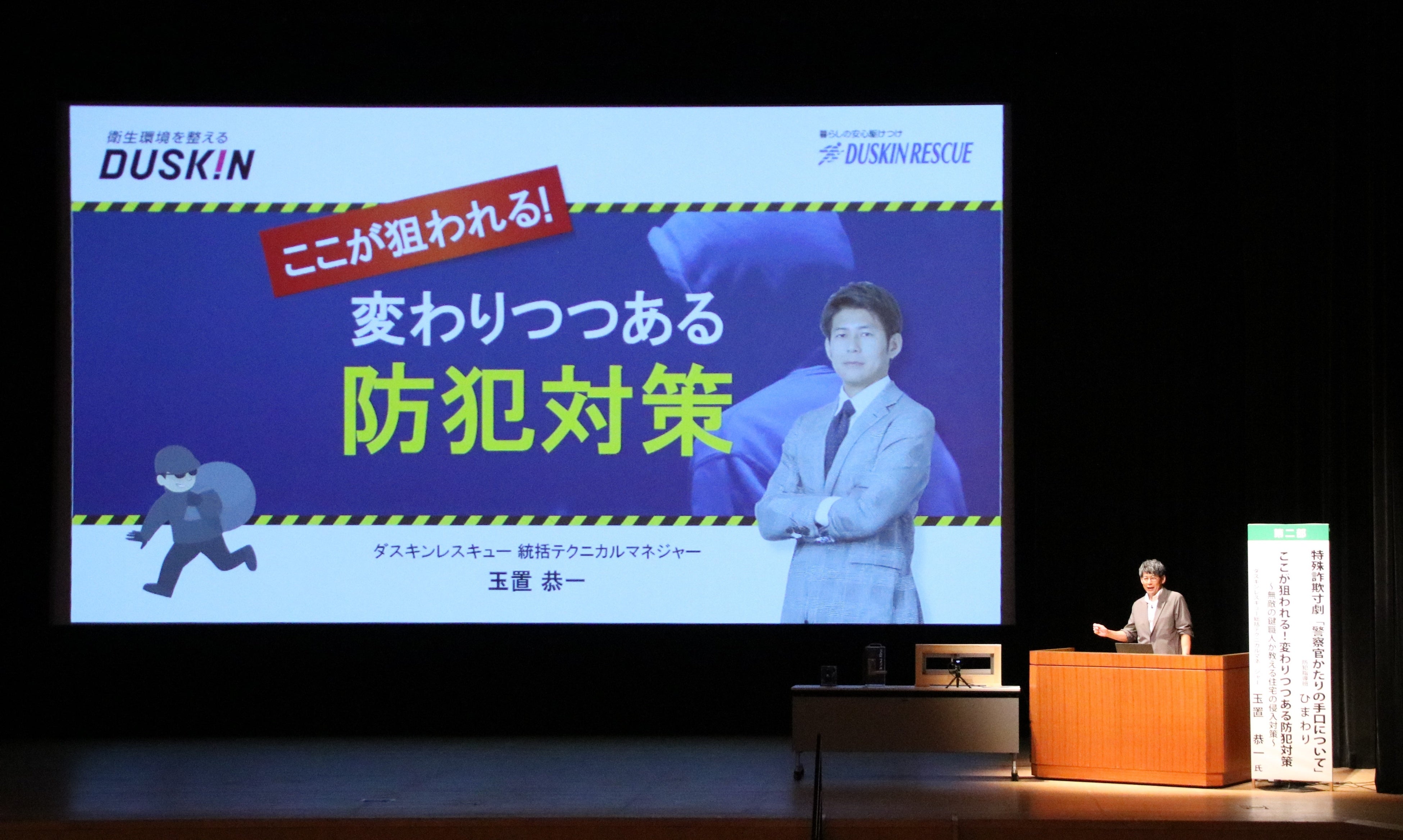 全国地域安全運動期間中の10月19日(日)には「防犯まちづくりフェスティバル in イオンモール川口前川」、翌20日(月)には「令和7年 埼玉県防犯のまちづくり県民大会」において、ダスキンレスキューサービス事業 統括テクニカルマネジャーであり、テレビ番組「開かずの金庫を開けろ!」で知られる鍵職人・玉置恭一が講演を実施し、埼玉県の犯罪統計をもとに、侵入窃盗の最新傾向や、物理的侵入を防ぐための具体的な対策について、地域の皆さまに向けて分かりやすく紹介しました。また、ダスキンサービスマスター事業による「防犯フィルム」のデモンストレーションでは、実際に窓ガラスを叩いても簡単には破れない様子を披露し、防犯対策の有効性を体感いただきました。