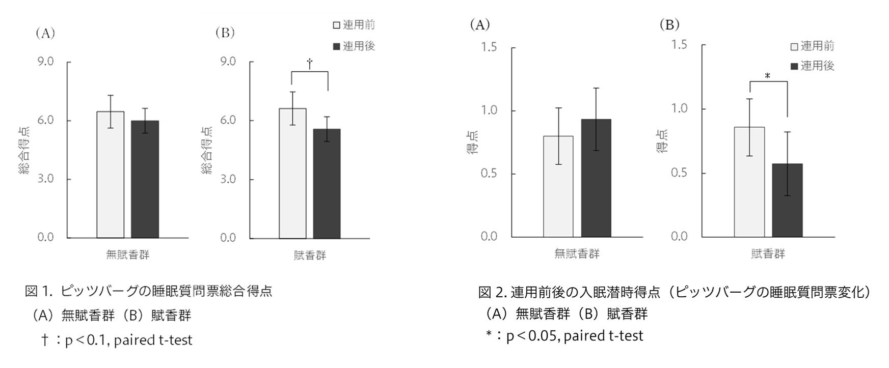 1.賦香群は継続使用により、睡眠の質が上昇傾向にあり入眠までの時間が短縮