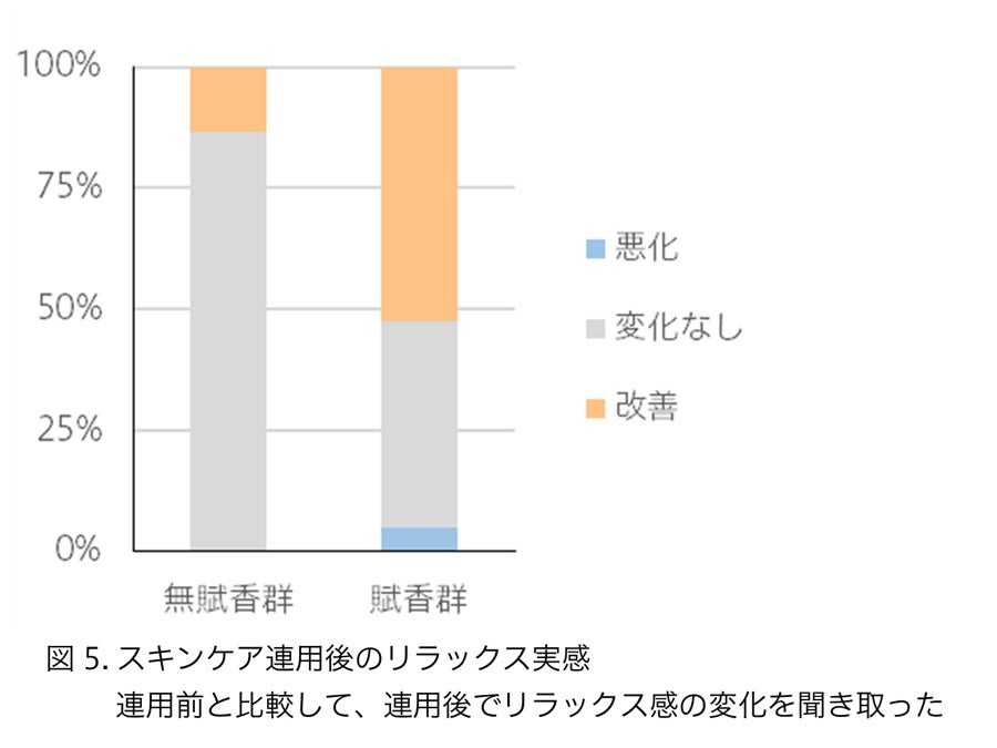 継続使用後のリラックス感をアンケートで評価した結果、賦香群ではリラックス実感が有意に改善していました(図5)。
