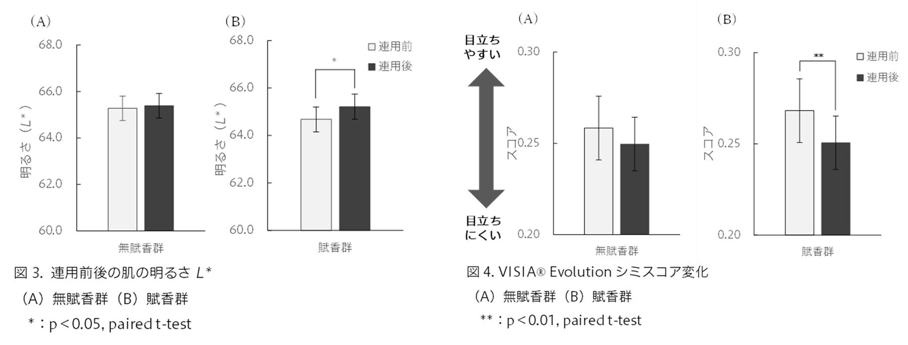 2. 賦香群は継続使用により肌の明るさが向上し、シミの目立ちやすさが低下