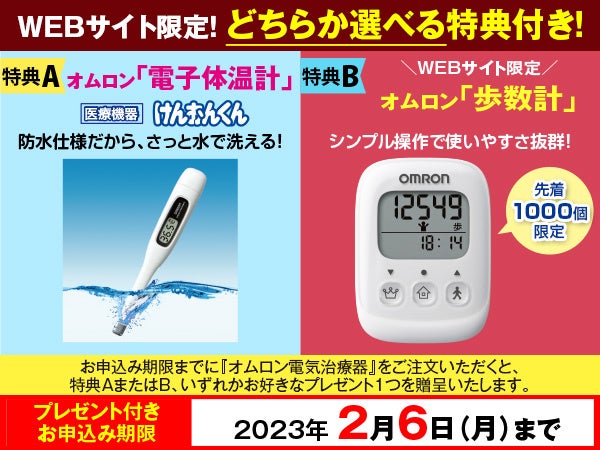 2月6日(月)までのキャンペーン期間中にWEBサイトから『オムロン電気治療器』をご購入いただくと、特典A「オムロン 電子体温計」と特典B「オムロン 歩数計」のどちらかお好きなプレゼントを添えて、お届けいたします。