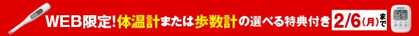 2月6日(月)までのキャンペーン期間中にWEBサイトから本商品をご購入いただくと、特典A「オムロン 電子体温計」と特典B「オムロン 歩数計」のどちらかお好きなプレゼントを添えて、お届けいたします。