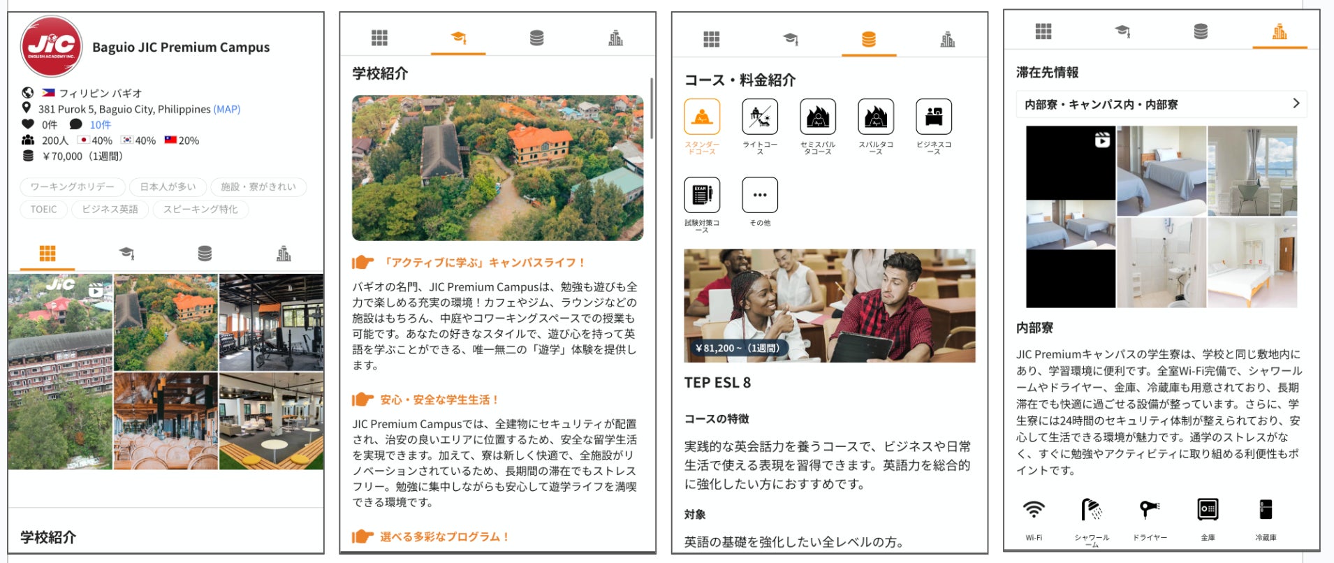 ネイティブキャンプ留学では、ユーザーが必要な情報を分かりやすく把握できるよう、常に丁寧で明確な情報提供を心がけています。JICの詳細情報は、以下の4つのカテゴリーに分けて掲載しており、知りたい情報を的確にお届けします。
