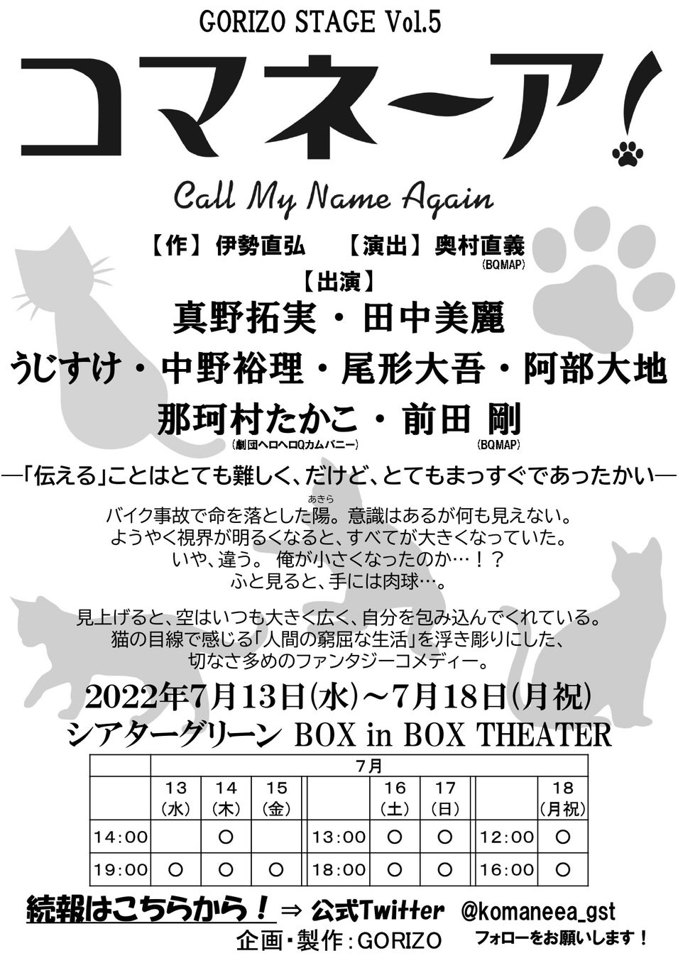 GORIZO STAGE『コマネーア!〜Call My Name Again〜』が2022年7月13日 (水) ~2022年7月18日 (月・祝)にシアターグリーン BOXinBOX THEATER(東京都豊島区)にて上演されます。チケットはカンフェティ(運営:ロングランプランニング株式会社、東京都新宿区、代表取締役:榑松 大剛)にて6月17日(金)より発売開始予定です。