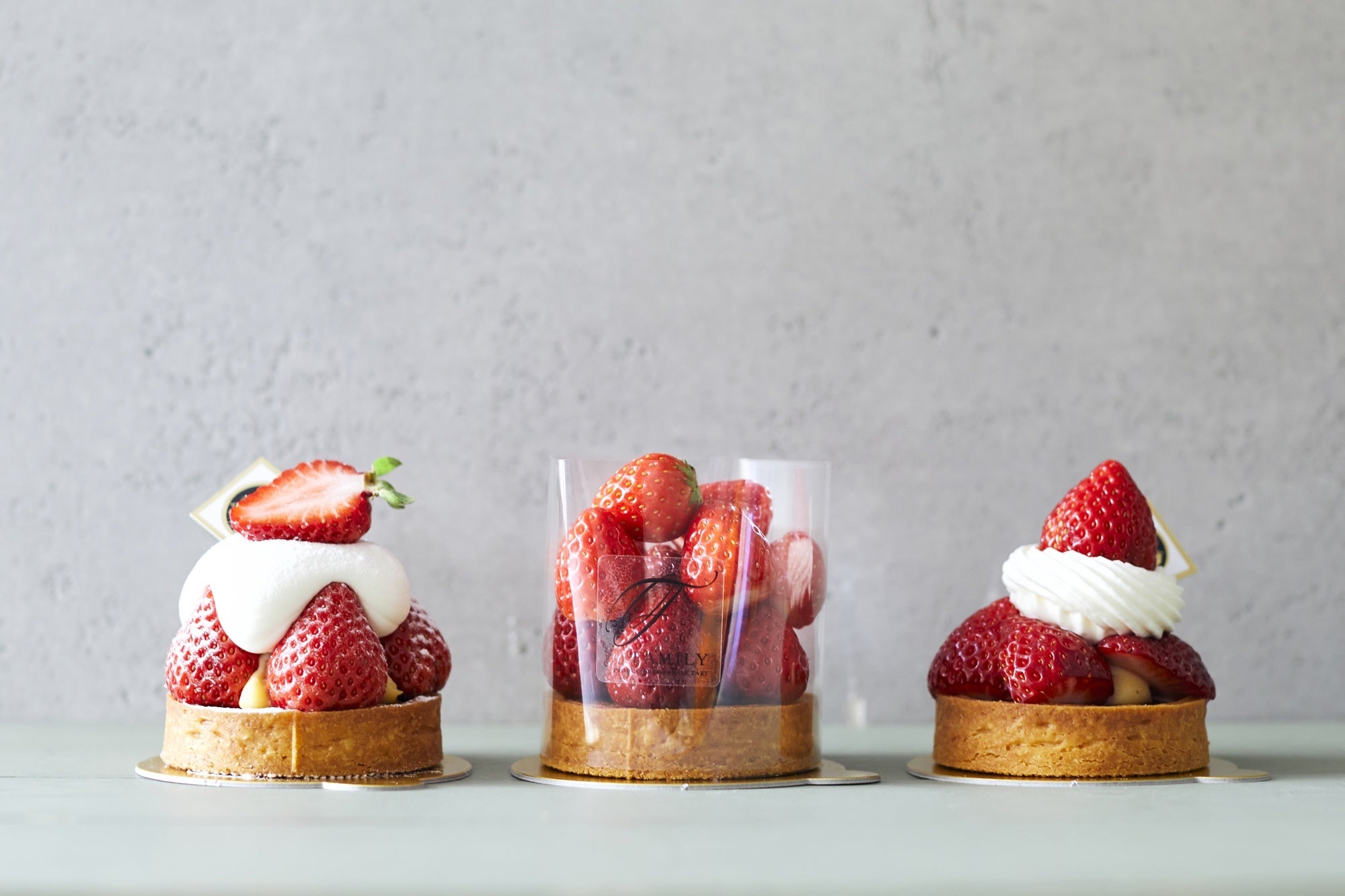 大阪・此花区にある果物屋が、自慢の仕入れ力を生かして手掛けるタルト。“あまおう” や此花区で採れる、口の中ですっと溶けるようにやわらかい完熟いちご “よつぼし” を使ったタルトに加え、たっぷりと積まれたいちごが崩れる様子を楽しんでほしいという果物屋ならではの発想で作ったお店の看板商品 “ごろごろいちご” をミニサイズにした“ミニごろごろ”も登場。フルーツのおいしさを引き立て、さっくりとした食感と風味豊かなタルト生地は、和歌山の人気パティスリー「GalleryΣ.」のオーナーシェフ上野山貴之さんが開発。パティスリーを訪れた「ふぁみり~たると」の社長・荒山拓哉さんが、上野山さんと意気投合してレシピを提供されたという、フルーツのプロとケーキのプロが手を取り合って生まれたおいしさです。