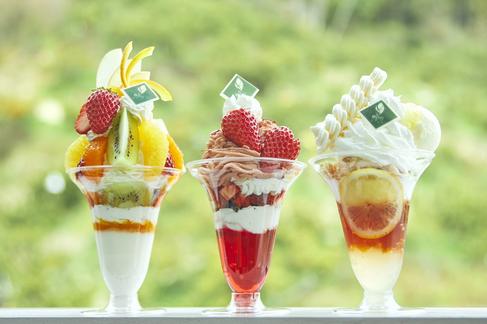(左から)フルーツ農園パフェ(1個)1,430円 いちごモンブランパフェ(1個)1,650円 レモン農園パフェ(1個)1,100円