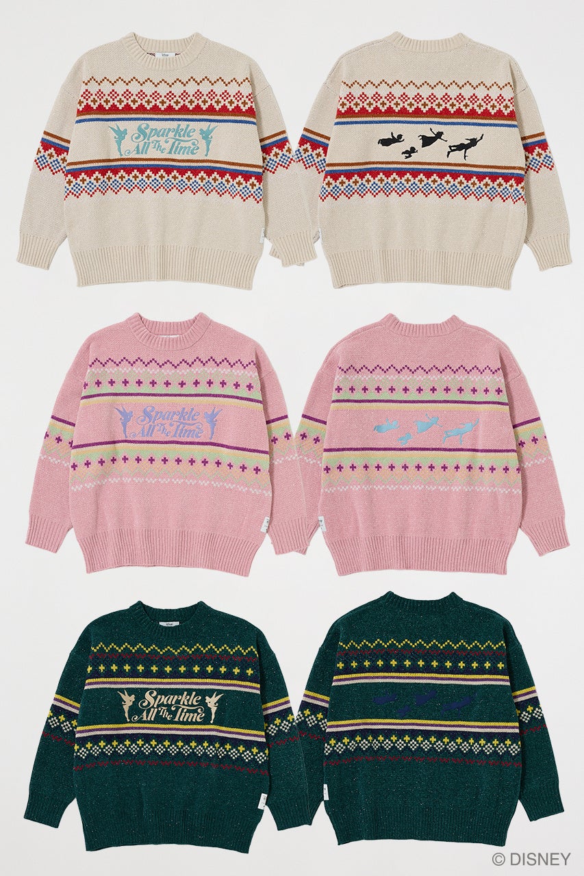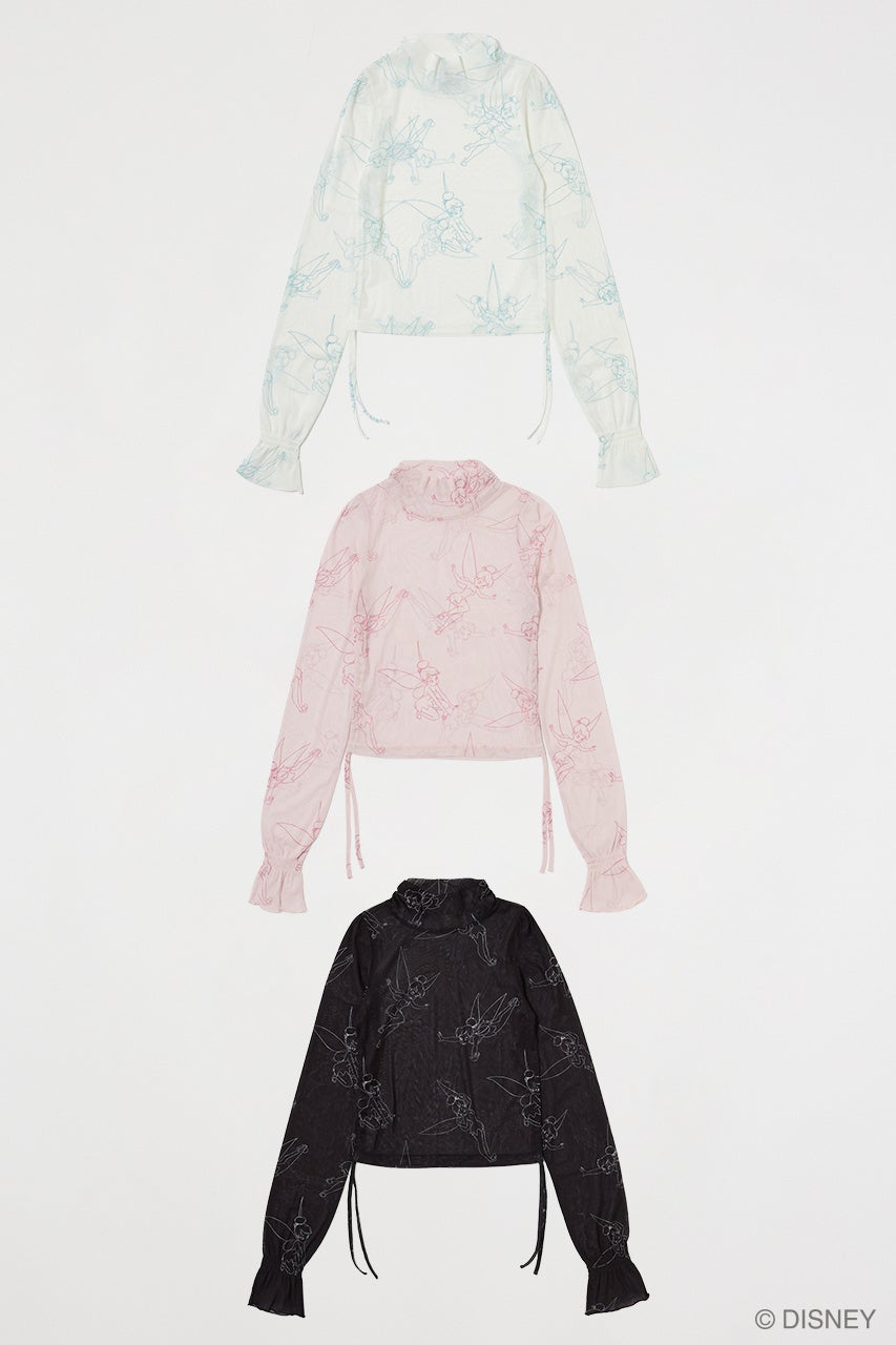 彼女の代名詞である“キラキラと舞う金の粉”を、アイテムのテクスチャーとディテールで表現。フェアアイル調の柄をモール糸で丁寧に編み立て、そこに繊細なラメ糸を織り交ぜたユニセックスサイズのニットには、ティンカー・ベルのシルエットを緻密な刺繍で表現。ヴィンテージライクなクラフトマンシップを感じさせます。ラフタッチのアートを大胆に総柄にしたシアー素材のトップスは、キャンディースリーブや脇のブラウジングといったギミックで、インナーとしてもスタイリングに華を添える一枚です。