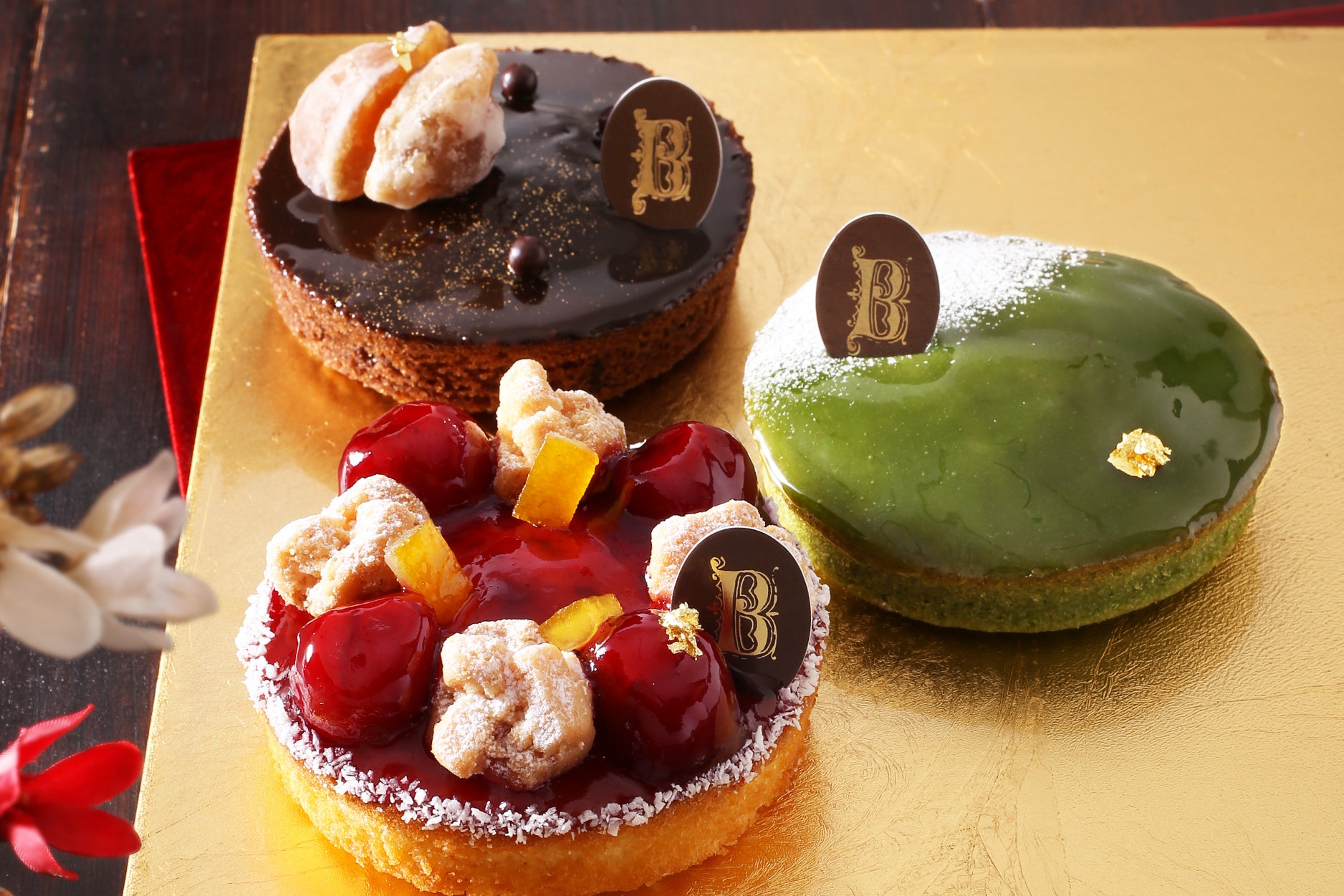 抹茶やマロン、フルーツなどをあしらって、お正月らしく華やかに仕上げた3種のガトー・ナンテ。帰省の手土産や新年のお祝いにもおすすめです。