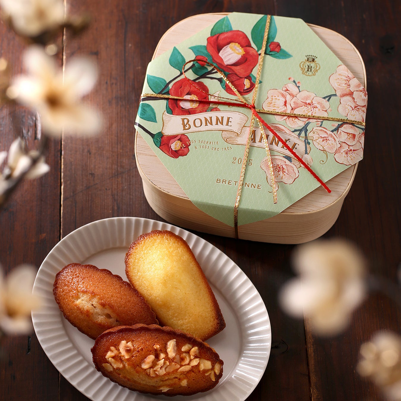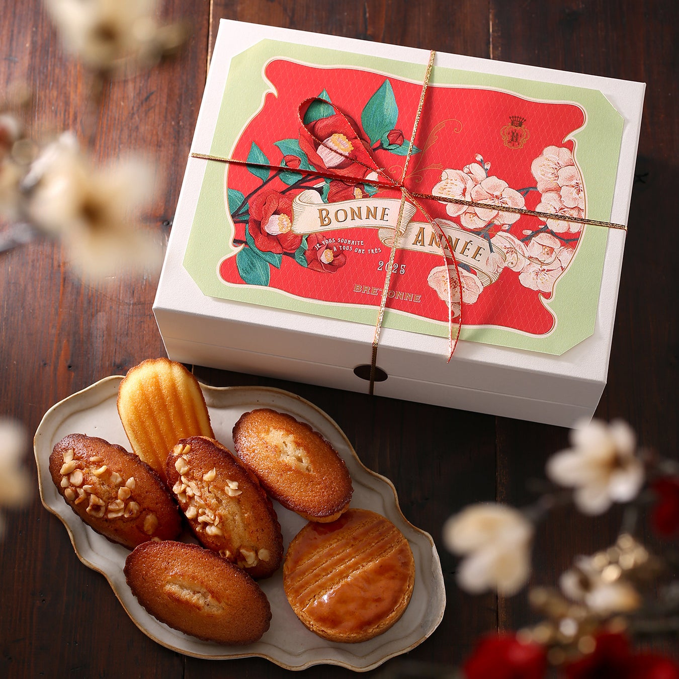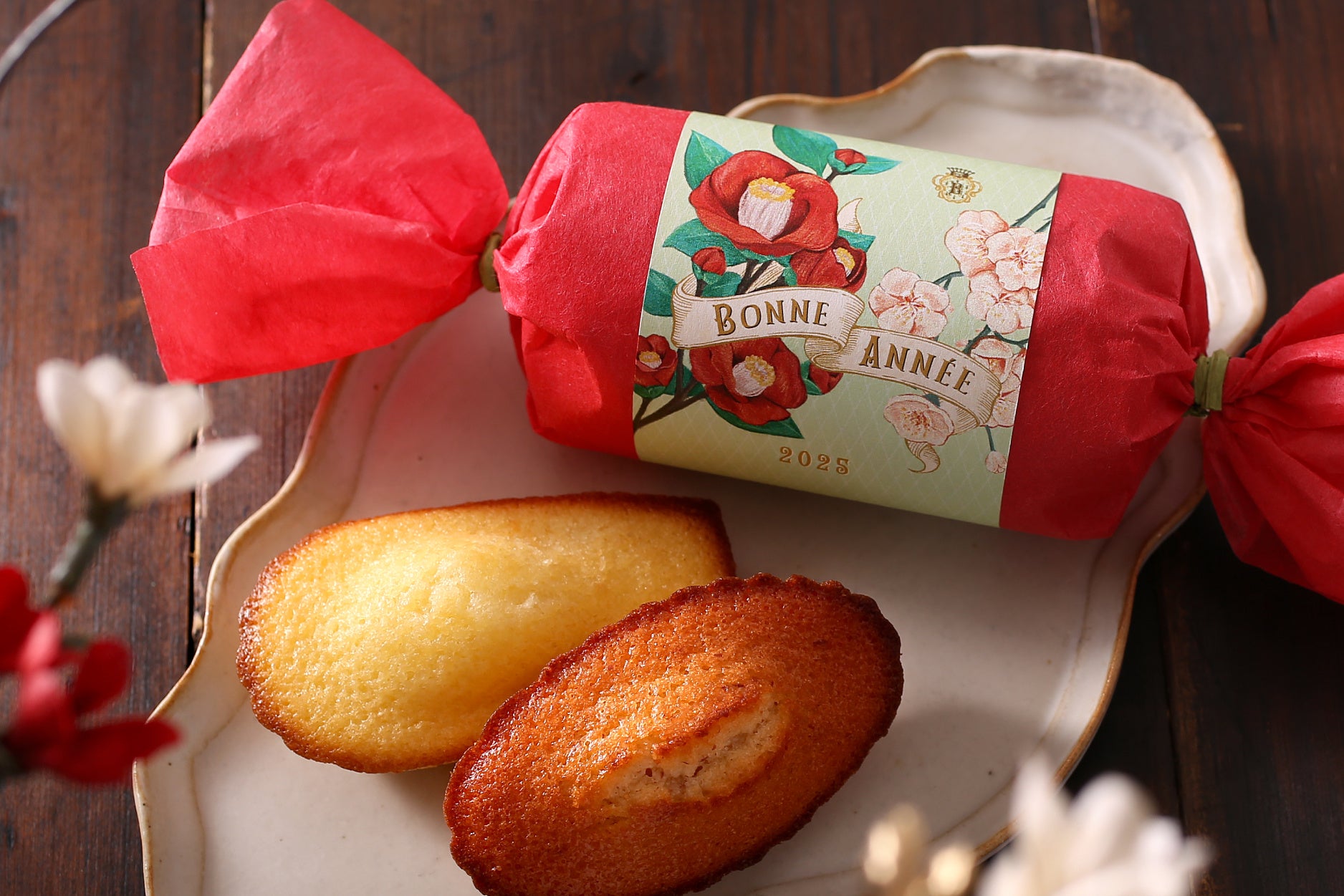 椿や梅の花のイラストが華やかな期間限定パッケージに、香ばしいヘーゼルナッツとキャラメルのコクが広がる季節限定の「フィナンシェ〈キャラメル・ノワゼット〉」や焦がしバターがコク深い人気の「フィナンシェ」など、自慢の焼き菓子を詰め合わせました。パッケージにはフランス語で「2025年がみなさんにとってすばらしい年でありますように」のメッセージが入っていますので、新年のご挨拶や大切な方への贈り物にもおすすめです。