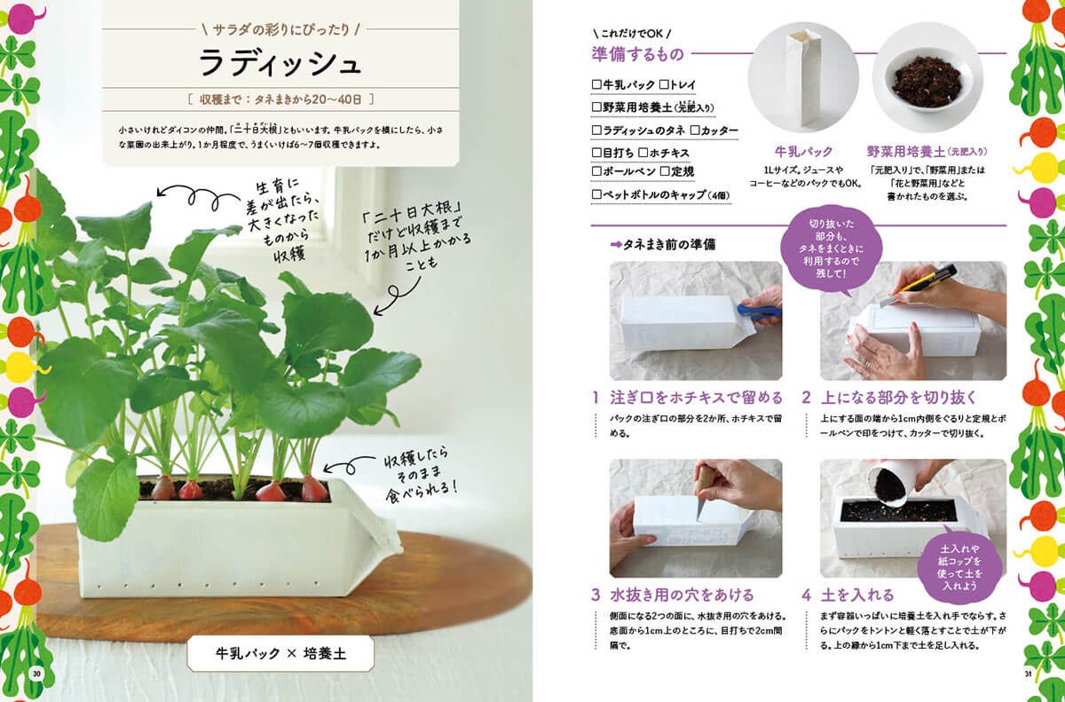 本書は、野菜・ハーブと容器・植え込み材料の組み合わせで12パターンで栽培法を紹介。⾷器洗い⽤のスポンジや⽔耕栽培⽤の発泡煉⽯など、⼟を使わない栽培も掲載しています。
