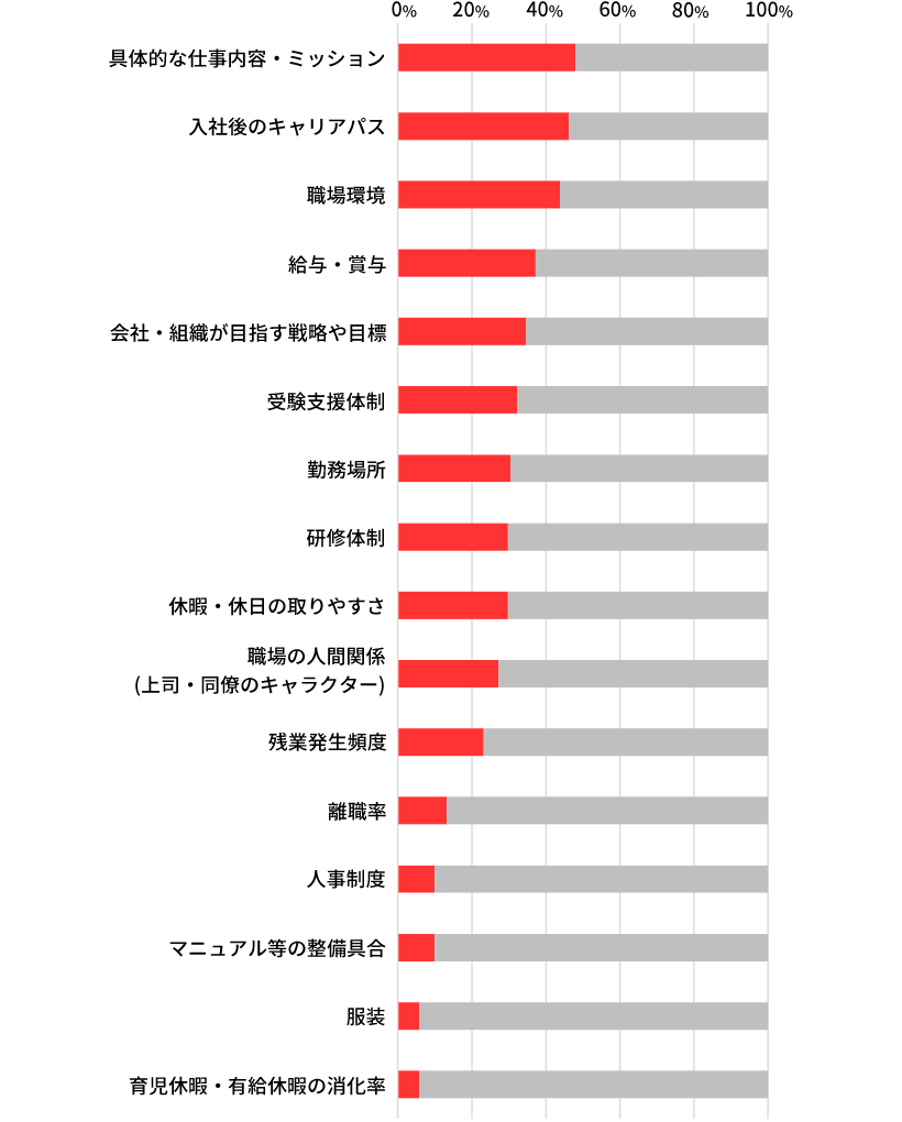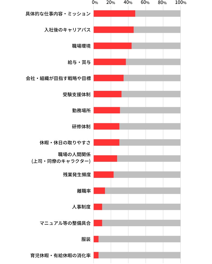 【6. 就職・転職検討動機】の結果と合わせてみると、“仕事内容”や“将来どのような経験が積めるか”が就職・転職の動機となり、就職・転職先を選ぶ際のポイントにもなっていることが分かる。