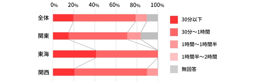 全地域で「30分~1時間」(59%)が最も多く、過去のアンケート結果と同様の結果となった。