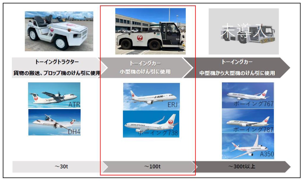 このたび、那覇空港に充電環境が整ったこと、導入する電動トーイングカーが運用可能なボーイング737型機を14機保有する日本トランスオーシャン航空が多数運航していることから、電動トーイングカーの効果を最大限に生かせる環境であると判断し、那覇空港での運用開始を決定しました。