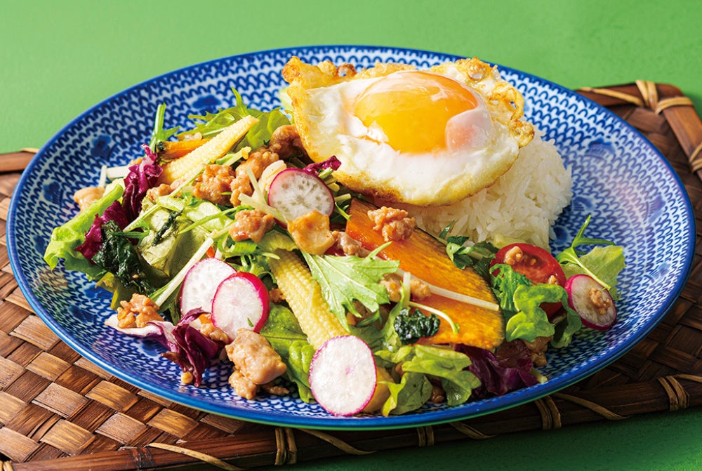 マンゴツリーで1番人気の「ガパオライス」に、ガパオ専門店「マンゴツリーキッチン ガパオ」で人気のサラダガパオが仲間入りいたします。レタスやトマト、ラディッシュにヤングコーンと彩り豊かな野菜と鶏のガパオを和えた、さっぱりしつつ食べ応えがあることで好評な一皿です。