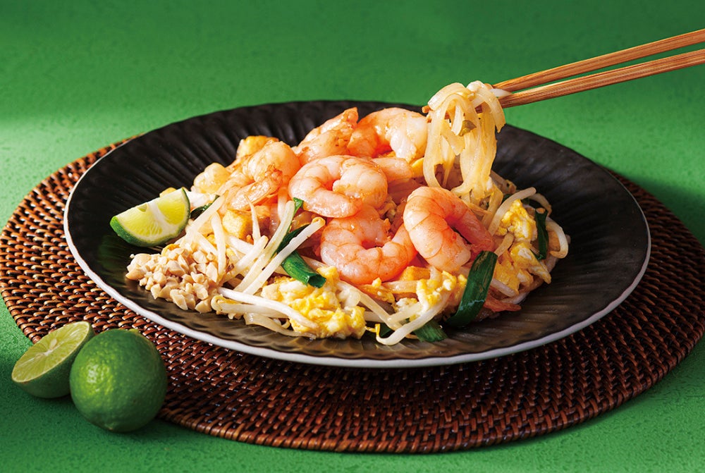 もちもちの自家製生米麺とプリプリのエビ、シャキシャキの野菜の食感が楽しめるタイの焼きそば。