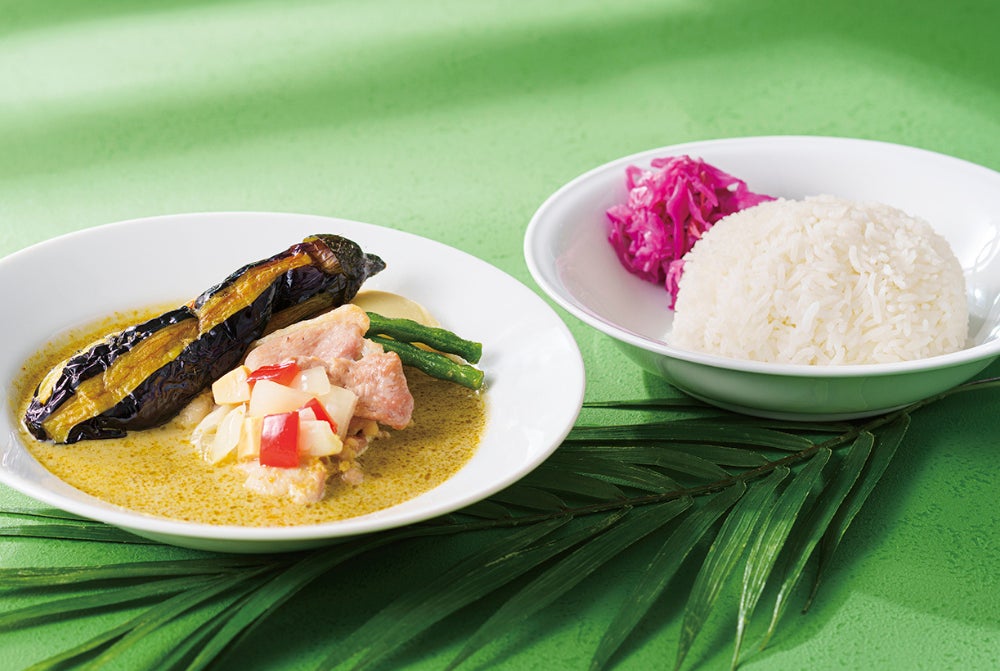 キリっとした刺激的な辛味とココナッツミルクの風味、ハーブの香りのバランスが絶妙なタイ定番の鶏肉とナスのグリーンカレー。マッシュポテトを混ぜると新たな味わいに。