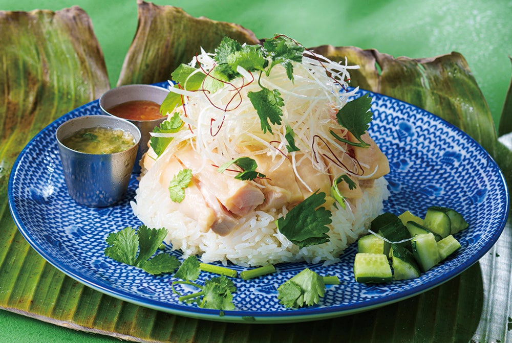 いつものカオマンガイに葱やパクチーをたっぷりのせて、よりヘルシーで爽やかな一品。
