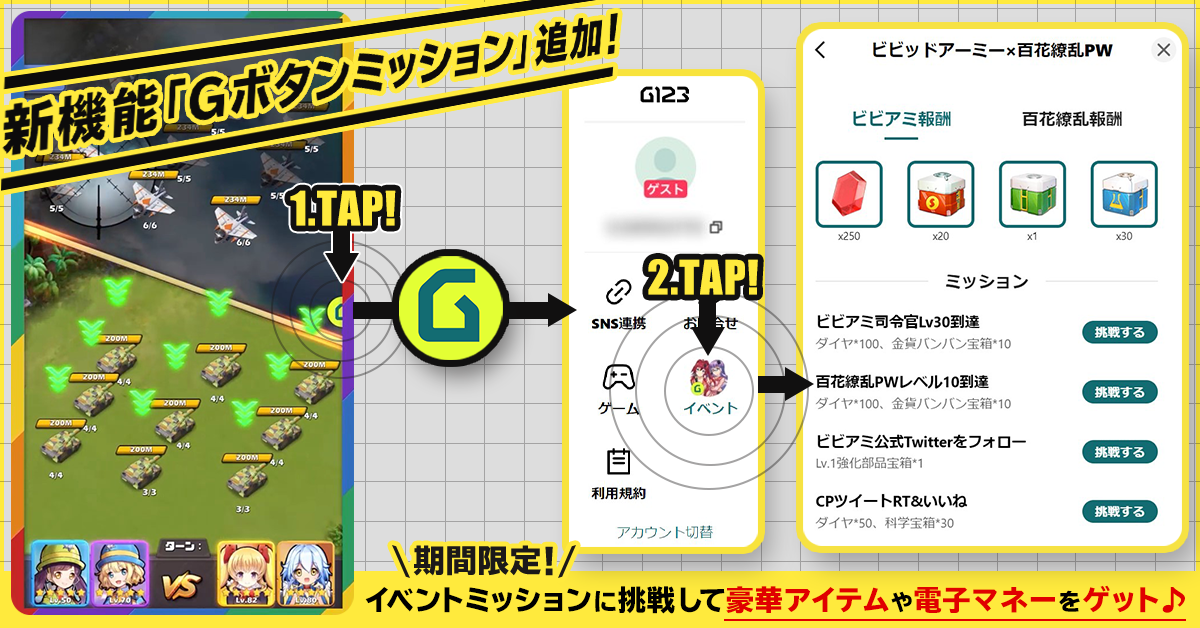 G123のゲーム画面端にある「Gボタン」から、各種イベントミッションに挑戦ができます。クリア報酬でゲーム内アイテムが獲得でき、さらにコンプリート報酬ではG123で使用できるビットキャッシュ最大5万円分が抽選で当たります。
