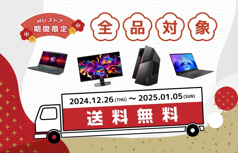 2024年12月26日(木)から2025年1月5日(日)の期間中、購入商品・購入金額にかかわらずMSIストアでご注文いただいた商品を全て送料無料でお届けいたします。