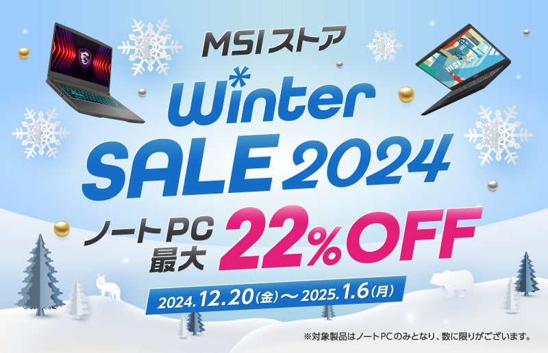 この度、エムエスアイコンピュータージャパン株式会社は2024年12月20日(金)から2025年1月6日(月)まで、キヤノンマーケティングジャパン株式会社が運営するMSI公式(以下、MSIストア)にて、『MSIストア Winter Sale 2024』(以下、Saleキャンペーン)を開催いたします。Saleキャンペーンでは、キャンペーン期間中に最新モデルを含む対象ノートPCをメーカー希望小売価格より最大22%OFFにて販売いたします。