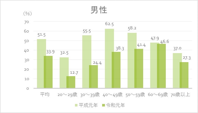 (図)厚生労働省「わが国の飲酒パターンとアルコール関連問題の推移」より作成。年代別習慣飲酒率(平成元年-令和元年)