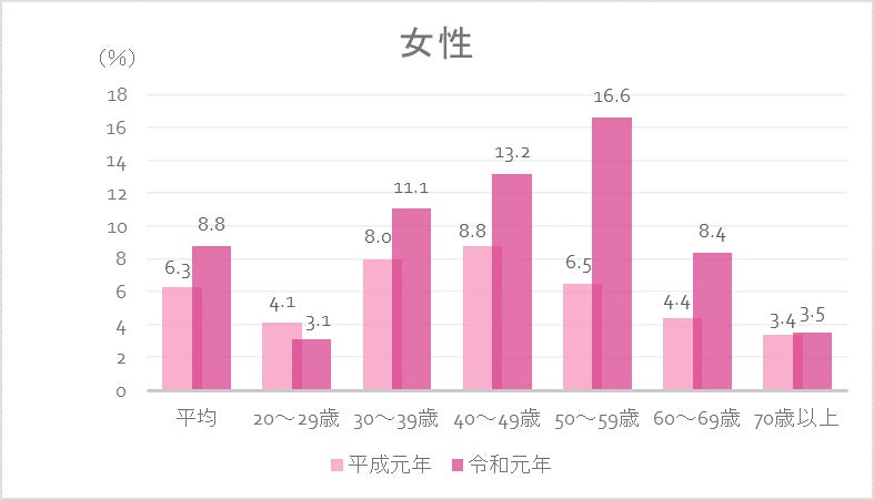 近年、女性の社会進出やライフスタイルの変化に伴って、女性とお酒の関係性が変化し、女性の飲酒に関連したリスクが増加しています。厚生労働省の調査によると、習慣飲酒者※1は、男性では平成元(1989)年の51.5%に比べ、令和元(2019)年では33.9%に大きく減少していますが、女性では同期間で6.3%から8.8%と増加しています。また同期間において、男性は全ての年代で減少している一方で、女性は30~70代の幅広い年齢層で増大しており、女性の飲酒問題の対策がより重要になっています。