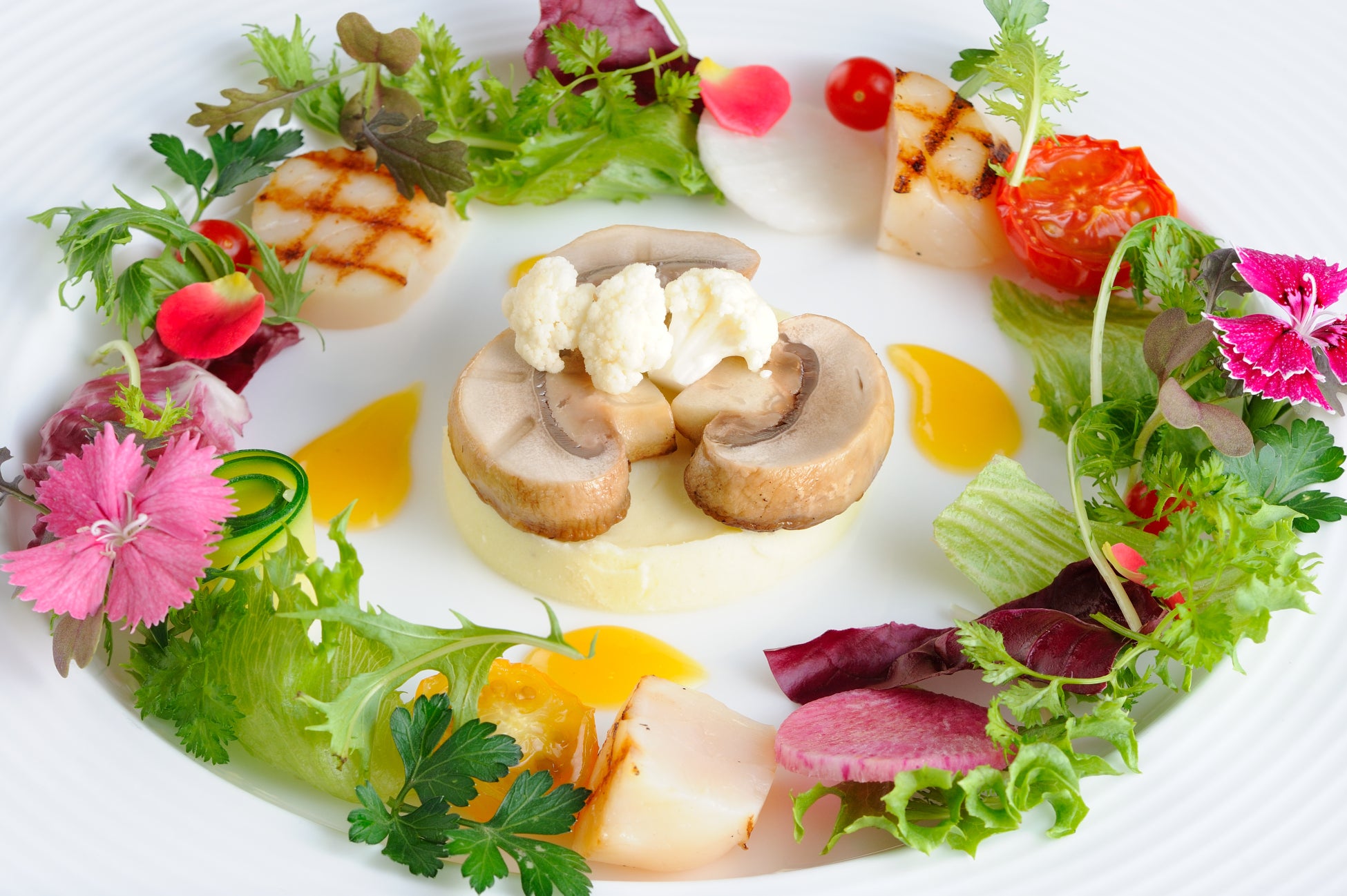 ・ホタテ貝のグリル カリフラワーのフォンダンと茸のマリネ