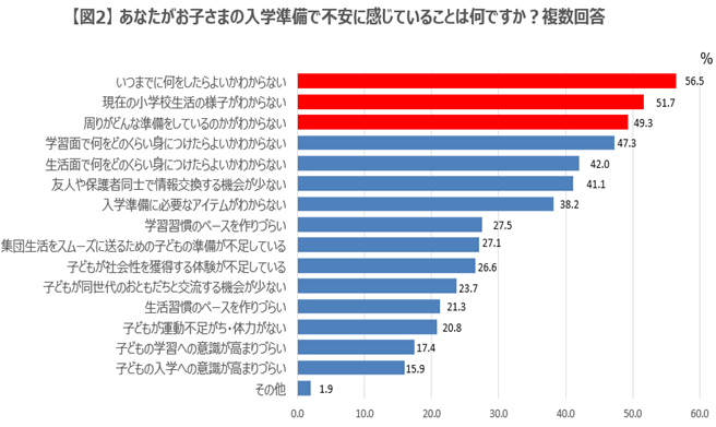 ・入学準備で不安に感じていることTOP3は「いつまでに何をしたらよいかわからない」(56.5%)「現在の小学校生活の様子がわからない」(51.7%)「周りがどんな準備をしているのかがわからない」(49.3%)