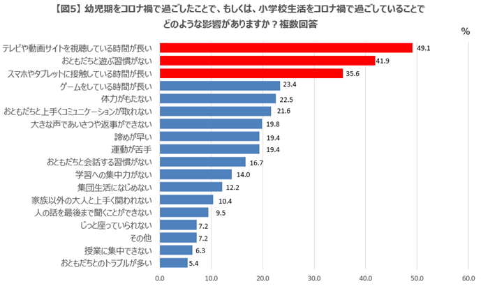 ・具体的な影響としては「テレビや動画サイトを視聴している時間が長い」(49.1%)「おともだちと遊ぶ習慣がない」(41.9%)など