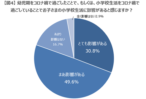 ・現1年生の保護者の約8割が幼児期をコロナ禍で過ごしたことで、もしくは、小学校生活をコロナ禍で過ごしていることでお子さまの小学校生活に影響があると回答(とても+まあの合計)