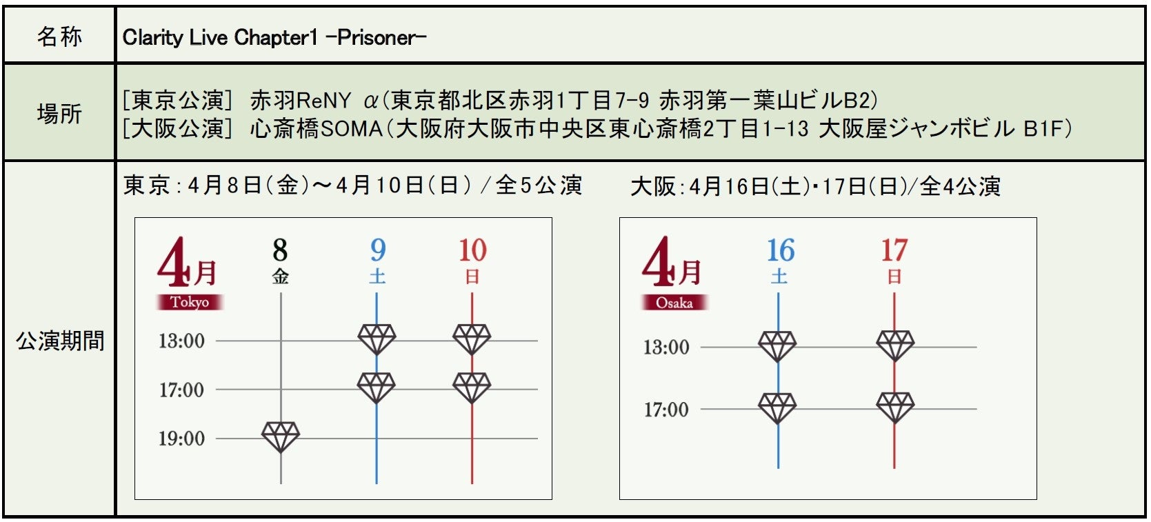 昨年7月に第一弾となる「Clarity Showcase Live -Chapter0-」上演し、多くのお客様にご好評をいただいた本公演。第二弾となる本作では、「Clarity Live Chapter1 -Prisoner-」と題し、昨年の公演に続くデビュー直後のClarityの様子を描きます。ライブハウスならではの迫力あるパフォーマンスでファンの皆様をより一層Clarityの虜(=Prisoner)に染めていきます。また、今回はキュアステ初となる二都市会場での開催となります。東京と大阪で、一部異なる演出も予定しておりますので、是非ご期待ください。