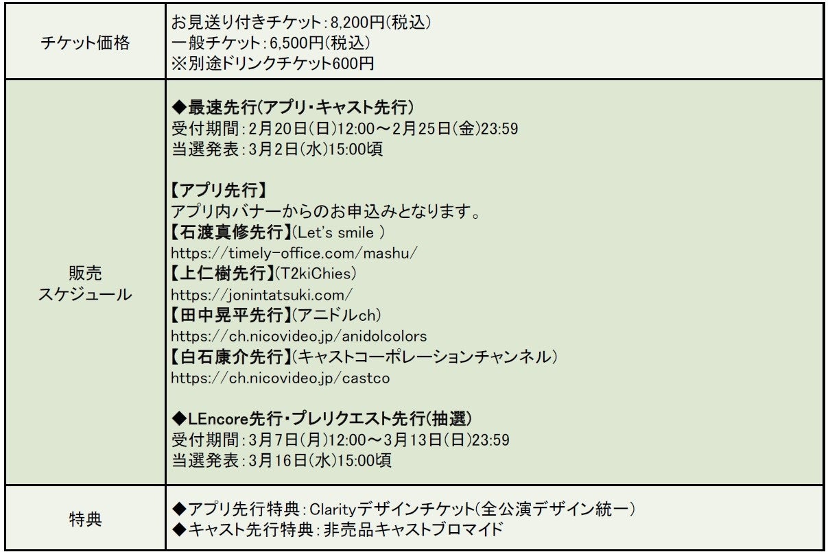 2月20日(日)よりアプリ及びキャストのファンクラブにてチケットの最速先行抽選を受付しておりますので、ぜひこの機会に「Clarity Live Chapter1 -Prisoner-」に足をお運びいただき、ライブハウスでClarityの生のパフォーマンスをお楽しみください。