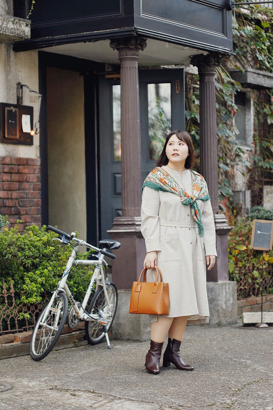 シンプルな1枚着に変化をつけたい時は、プリントストールで華やぎをプラス。顔周りにポイントを作ることで、目線が上がりすっきりとした着こなしが叶います。肩から羽織れる大判ストールは、朝晩の外出や室内での寒さ対策としても活躍。ラフな片結びのアレンジで、程よくリラックス感のあるルックスに仕上げました。秋色の花柄とレザーのバッグ・ブーツをリンクさせれば、甘さを抑えた大人な表情に。