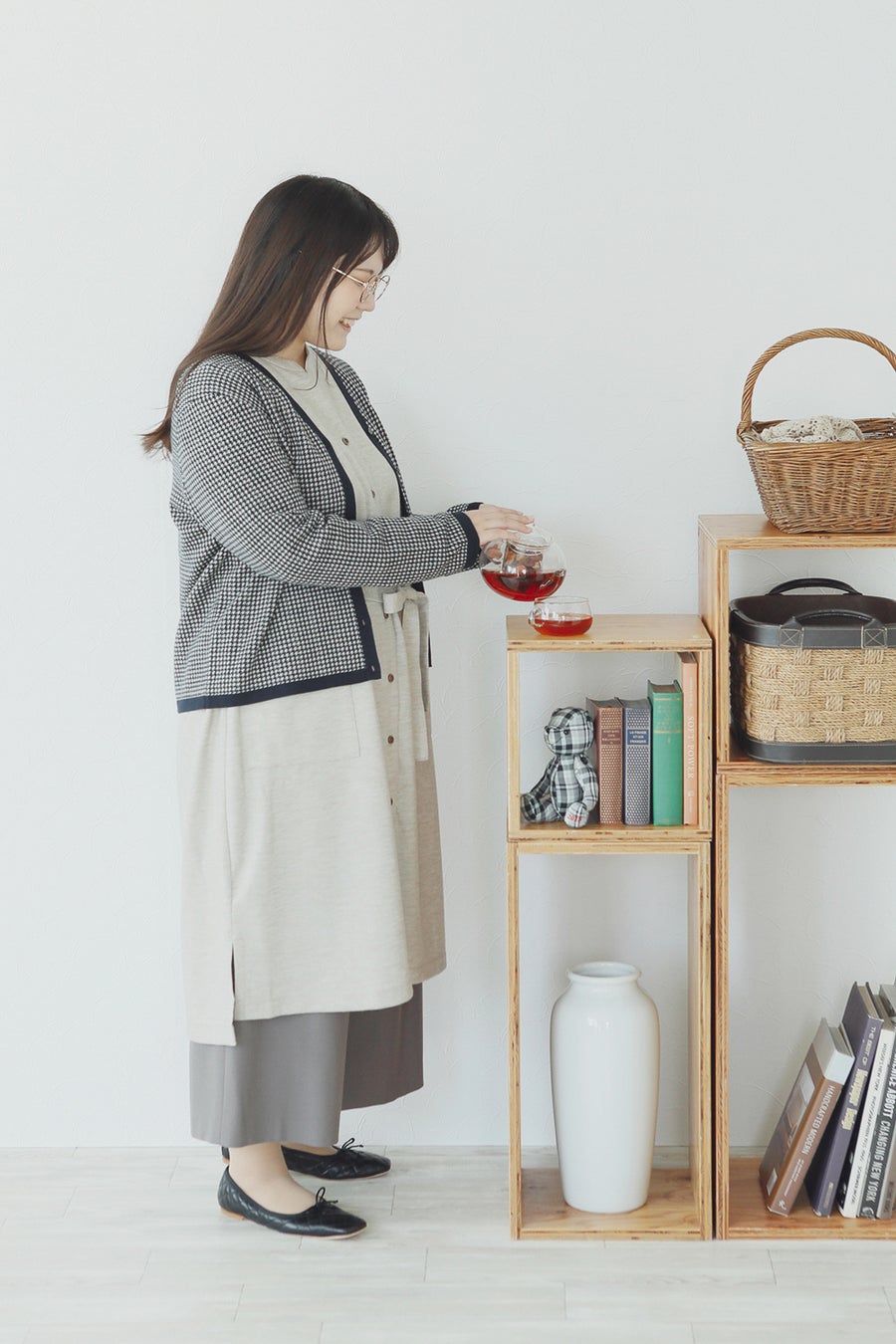 お家で過ごす休日は、ストレッチの効いたガウチョパンツを重ねてリラックス。カーディガン&ボトムのダブルレイヤードも、シックなカラーでまとめるとバランスのとれた着こなしに仕上がります。また、ワンピースの共布ベルトでウエストマークすれば、リラクシーなシルエットにメリハリを与え、さりげなくスタイルアップ。足首をのぞかせて軽やかに着こなすのもポイントです。