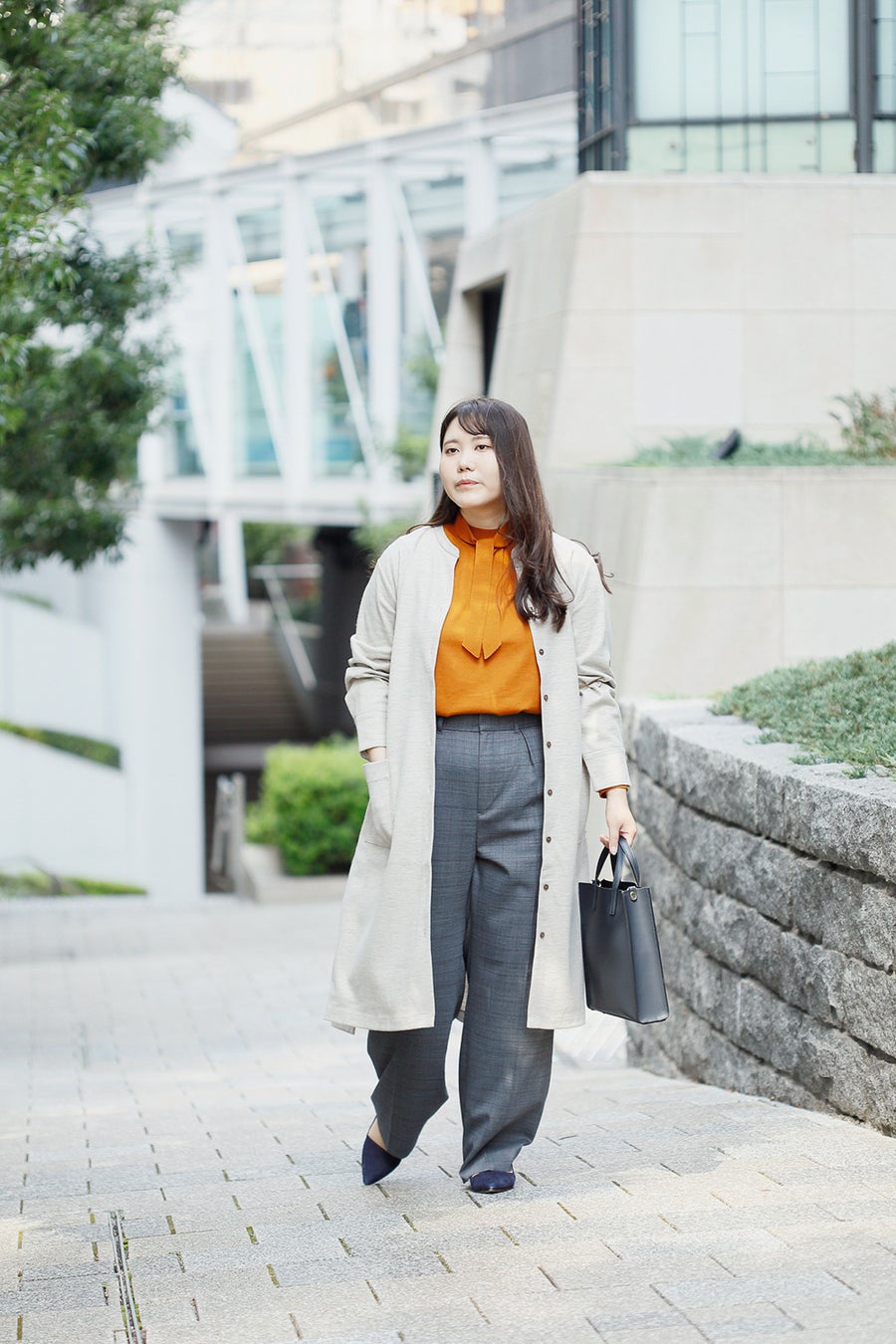 ジャケットレスのオフィスカジュアルスタイルに羽織れば、通勤にぴったりのアウターライクな着こなしに。温かみのある圧縮ウール素材は、秋冬にマストなニットとも好相性です。両脇にはポケットがあり、すぐに取り出したい携帯やハンカチが入るのも嬉しいポイント。全体は色味を抑えつつ、こっくりとしたオレンジのボウタイニットを主役にすることで、季節感と華やかさをプラスしました。