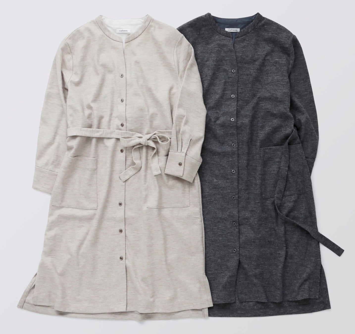 温かみのある圧縮天竺素材を使用したシャツワンピース。汎用性の高いベーシックなデザインで、合わせるアイテムによって様々なテイストにマッチします。アレンジが楽しめる共布ベルト付き。