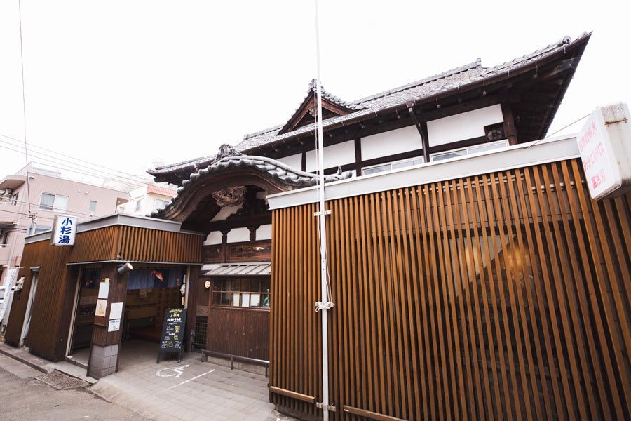 JR高円寺駅から徒歩5分、活気あふれる商店街を通り抜け住宅街に入る、昭和にタイムスリップしたような破風屋根のレトロな建物が存在感をしめしています。音楽、ファッション、サブカルチャーを中心とした多様な中央線カルチャーと、古き良き歴史が混在する高円寺の憩いの場として、多くの方から愛されている銭湯です。名物ミルク風呂、週替り・日替わり風呂、水風呂があり、温冷交互浴は小杉湯の代名詞となっています。