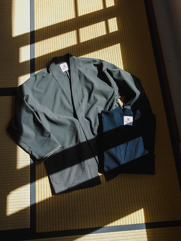 湯上りに和服の上から防寒着として着用されていた「どてら(丹前)」や、「半纏」など、日本の伝統的な衣類のデザインを現代的にアレンジしたジャケット。イージーケア(シワになりづらく、マシーンウォッシュが可能)、吸水速乾などの多機能な素材を使用した、ドライタッチで着心地の良い一着です。