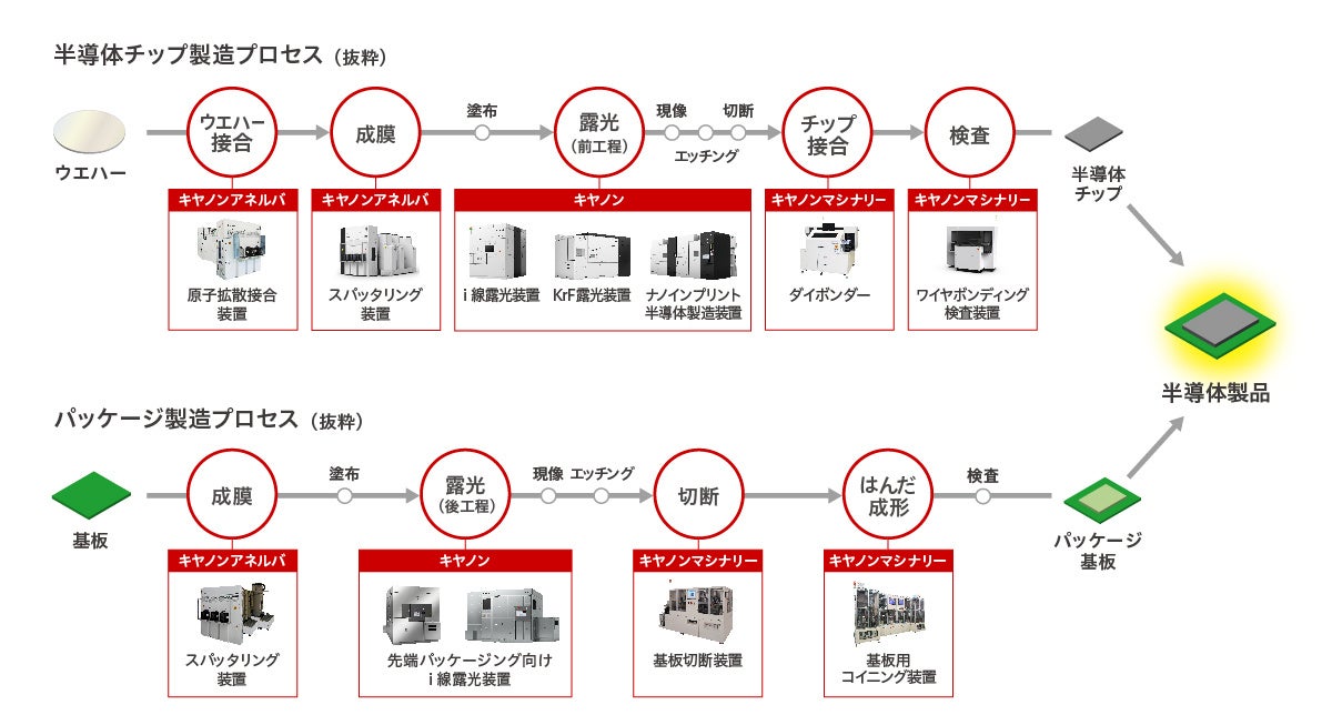 キヤノングループでは、半導体デバイス製造プロセスで使用される製造装置や、パッケージ基板製造プロセスに使用する製造装置のラインアップを有しています。