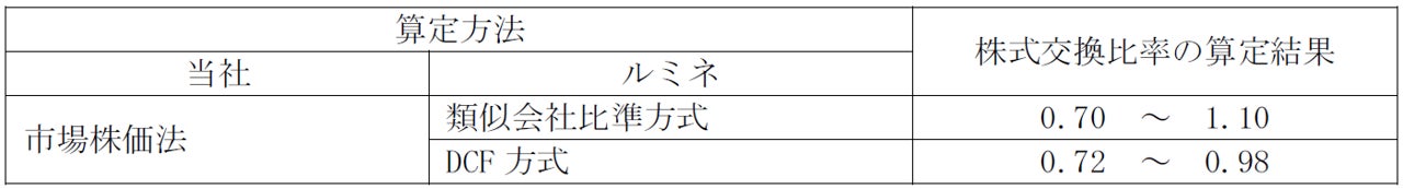 以上の結果、当社の普通株式1株当たりの株式価値を1とした場合の対象連結子会社2社の株式交換比率の算定結果は以下のとおりとなります。