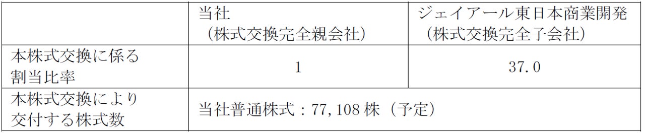 当社は、本株式交換に際して、本株式交換がその効力を生じる日の前日の最終のジェイアール東日本商業開発の株主名簿に記載又は記録されたジェイアール東日本商業開発の株主に対し、ジェイアール東日本商業開発の普通株式1株に対して、当社の普通株式37.0株の割合をもって、割当交付します。ただし、当社が保有するジェイアール東日本商業開発の株式については、本株式交換による株式の割当は行いません。