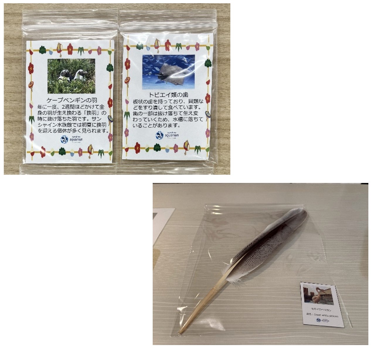 一部地域で「エイ(良い)正月を迎える」という意味で特別な日に食されているエイ。その縁起が良い“エイの(生え変わりで落ちた)歯”や、夫婦愛に溢れていると言われる“ペンギンの(換羽期に集めた)羽” 、慈愛の象徴とも言われる“ペリカンの羽” など、生き物好きの方に嬉しい、当館の生き物たちが落としたマニアックな縁起の良いプレゼント。何が当たるかは開けてからのお楽しみです。