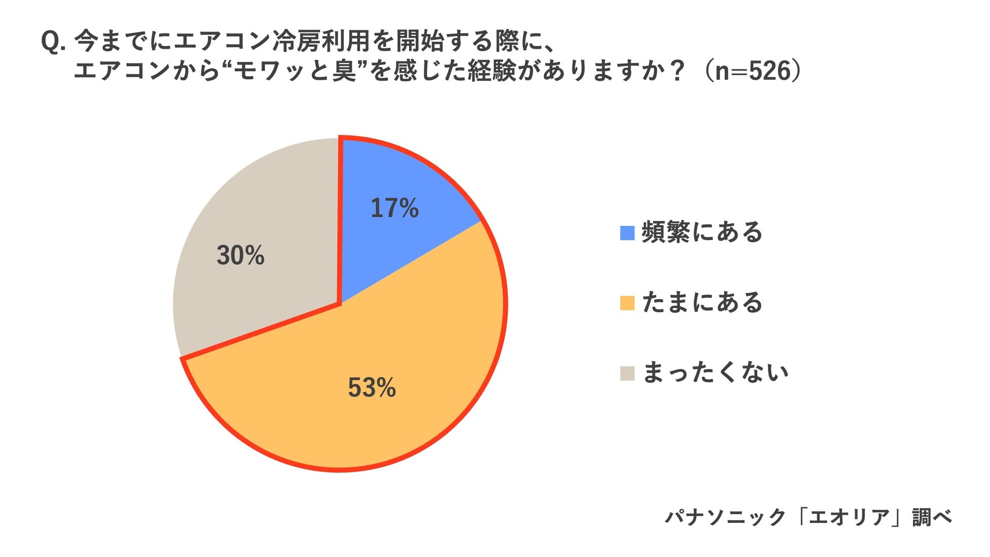 続いて、「今までにエアコン冷房利用を開始する際に、エアコンからモワッと臭を感じた経験がありますか?」とたずねたところ、「頻繁にある」17%、「たまにある」53%と、70%の方がモワッと臭経験者であることがわかりました。