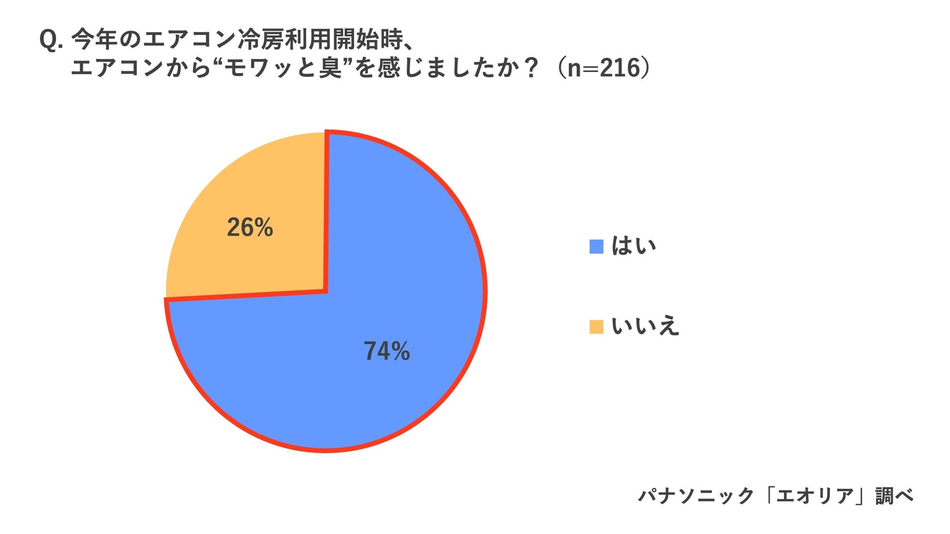さらに、今年すでにエアコン冷房利用を開始した方に「今年のエアコン冷房利用開始時、エアコンからモワッと臭を感じましたか?」とたずねたところ、「はい」74%、「いいえ」26%と、7割以上の方がモワッと臭を感じたことが明らかになりました。