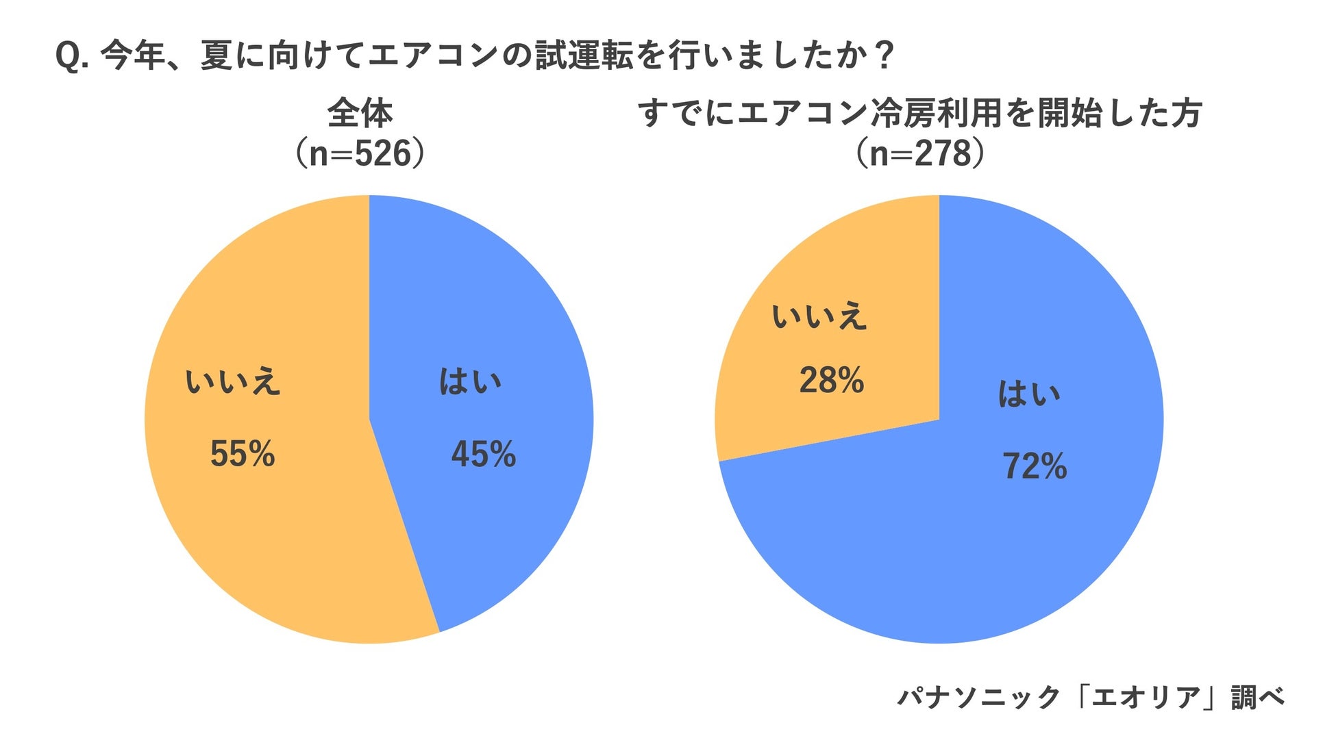 一方で、今夏のエアコン試運転状況については、試運転をすでに行った方が45%、まだ行っていない方が55%という結果に。すでにエアコンの利用を開始した方においては、「試運転を行った」72%、「試運転を行っていない」28%で、およそ3割の方が試運転を行わないままエアコンの利用を開始したことがわかりました。