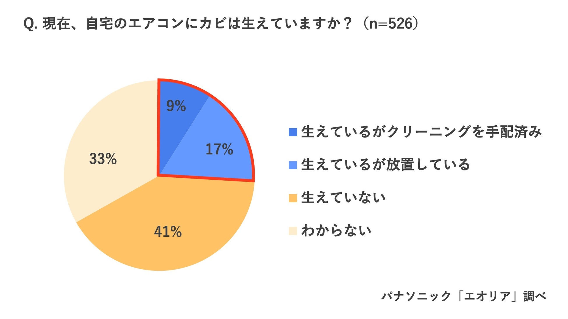 多くの方が経験しているエアコン冷房利用開始時のモワッと臭。このモワッと臭の原因は、エアコン内に溜まったホコリやゴミ、そしてカビなどです。自宅のエアコンのカビの発生状況については、「生えているがクリーニングを手配済み」9%、「生えているが放置している」17%と26%がカビの発生を把握していることがわかりました。一方、33%は「わからない」と回答しており、イヤなニオイを感じているものの、エアコンのカビの有無を把握していない方が3割程度いることがわかりました。