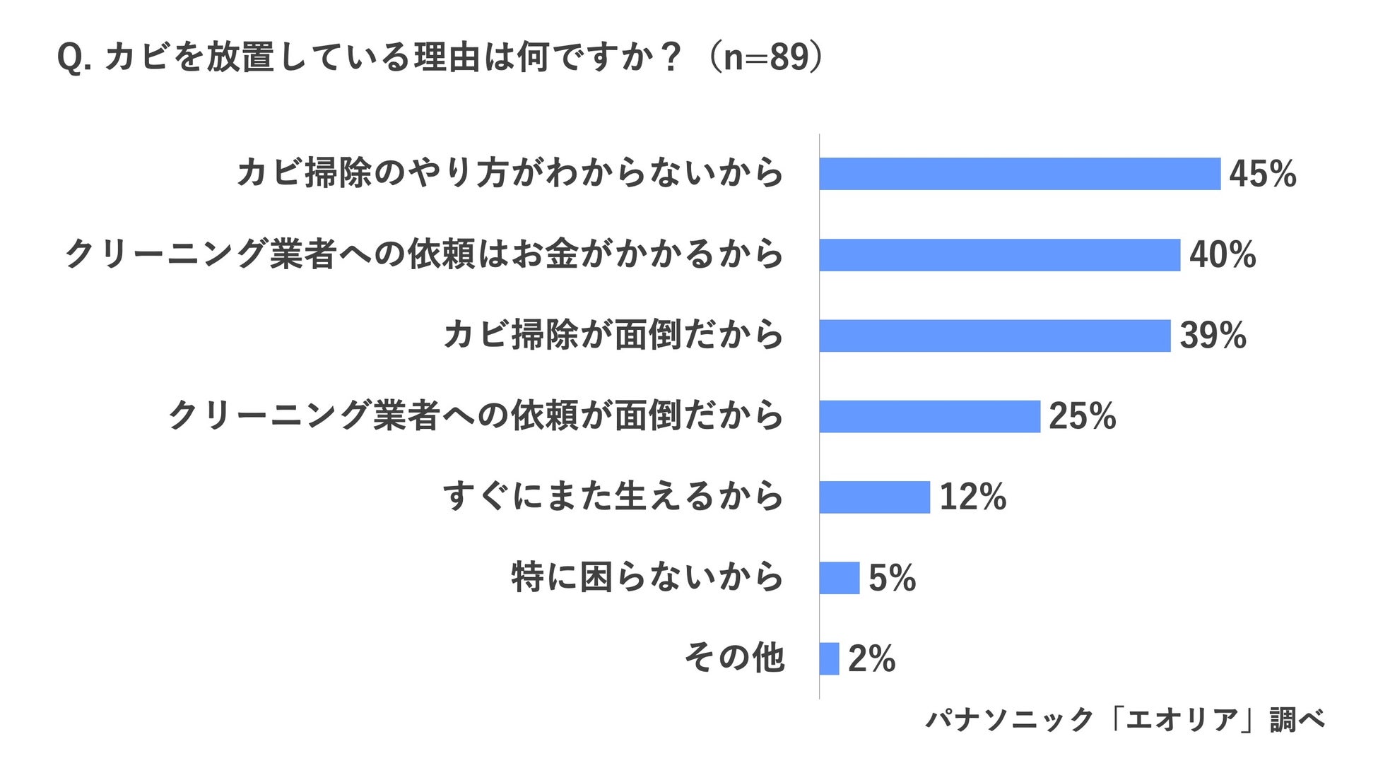 カビを放置している理由の上位は、「カビ掃除のやり方がわからないから」45%、「クリーニング業者への依頼はお金がかかるから」40%、「カビ掃除が面倒だから」39%で、知識・コスト・手間のハードルがうかがえます。
