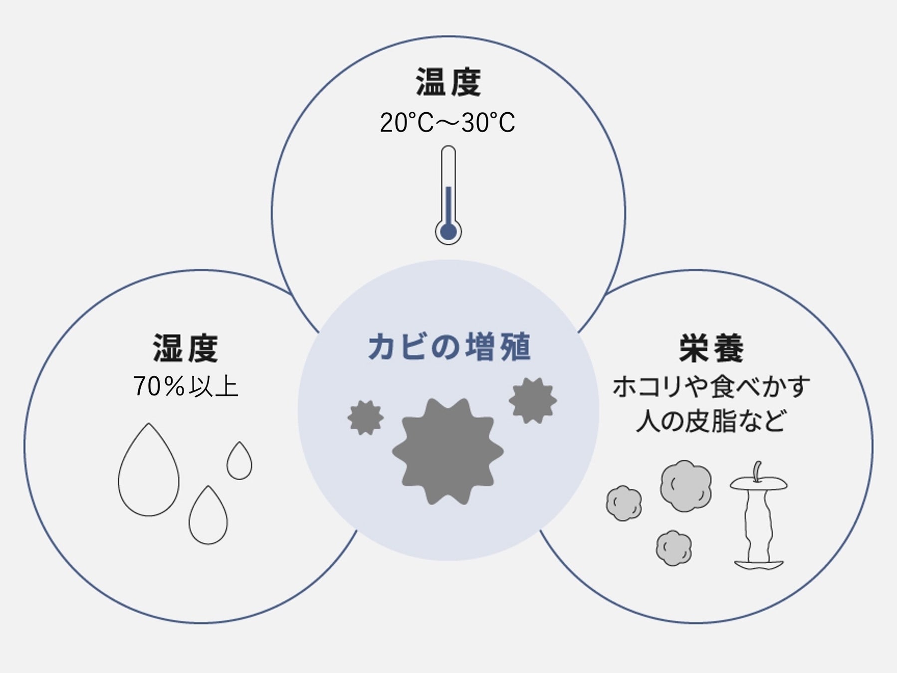 カビが生える条件は、主に「温度」「湿度」「栄養」の3つが挙げられ、これらの条件が揃うとカビが増殖します。室内で発生するカビについては、温度20℃〜30℃、湿度70%以上の環境がカビにとっては好条件です。梅雨どきはもちろん、夏の冷房や除湿運転使用時は、使用直後にエアコン内部に結露が発生しカビが生えやすいため、特に注意が必要です。カビが発生する要因である3要素のうち、「温度」と「栄養」は対策が難しいため、「湿度」をコントロールすることが大切です。冷房や除湿運転の後には内部を乾燥し、内部に水分を残さないようにしましょう。