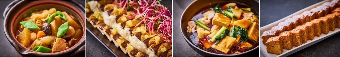 (写真左より)長野県郷土料理 「大平」、富山県産鰤の炙りカルパッチョ オニオンピュレ レモンヴィネグレット、長野県産野菜入り厚揚げのオイスターソース煮込み、富山県産米粉のキャラメルパウンドケーキ