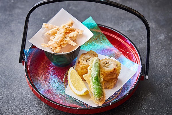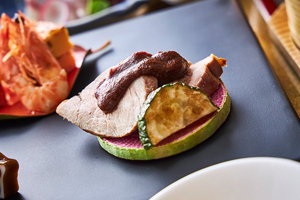 コースの前菜では“富山湾の宝石”と呼ばれる白海老を香ばしく揚げ、サクッとした食感をお楽しみいただける「白海老の唐揚げ」や、いか墨を和え熟成させた富山名産の“いかの黒作り”、色鮮やかな信州野菜のピクルスなど、富山・長野の食材をふんだんに味わうことができます。七輪鍋は、昨年もご好評いただいた“ノロゲンゲのコラーゲン鍋”をご用意いたします。ノロゲンゲは富山湾の奥深くに棲む深海魚で、ゼラチン質によるぷるぷるした食感と軽やかな味わいをご堪能いただけます。デザートの“りんごのパルフェ”では、長野県オリジナル品種の「シナノスイート」を 使用します。ジューシーで甘みが強く香りも豊かなシナノスイートは、味はもちろんのこと見た目や香りもお楽しみいただけるデザートになっています。